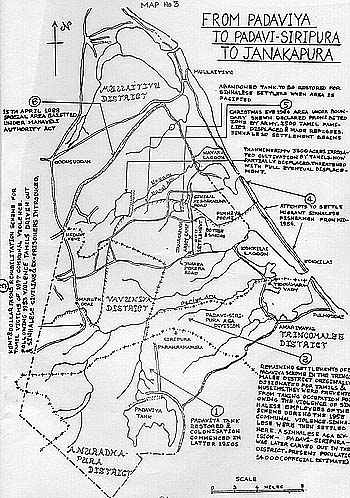 The set up was designed so as to protect the army at the expense of Sinhalese civilians and to gradually secure the expulsion of the Tamil population. The interior of System L was an extension of the Padaviya colonisation scheme of the 1950s to the north. The remaining Tamil populations were to the north and east of the core area. The forward settlements at Jankapura were such that the army was behind an earthen bund raised as a defensive redoubt. Beyond the redoubt facing the Tamil inhabited area were up to 400 dwellings of Sinhalese settlers, in the form of a shield. Beyond the Sinhalese dwellings, towards the Tamil habitations ( to the east) were open fields belonging to Tamils known as Punniya Poomi (Blessed land). The inscription on one of the several wells in these fields indicated the year 1921, showing that the fields were cultivated for 3 generations or more. Beyond the fields, going further eastwards is jungle, followed by a line of low hills from which the sea is visible (see Map 3). The bund, Sinhalese settlements and the open fields (going eastward) therefore made up the army's defence.It also explains why the brigadier blamed the settlers when Janakpura camp was demolished on 25th July [see 4].